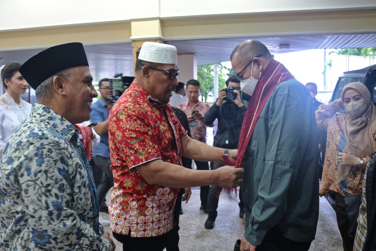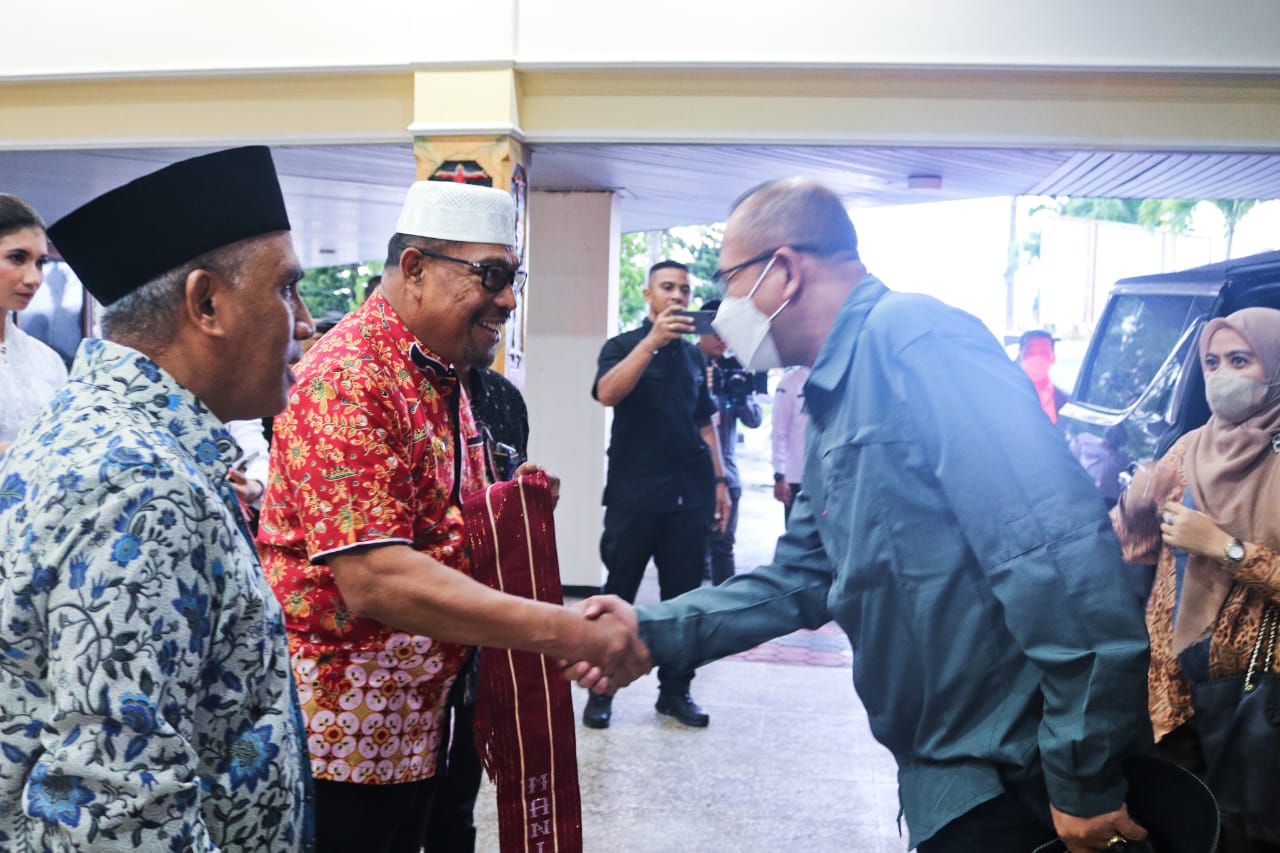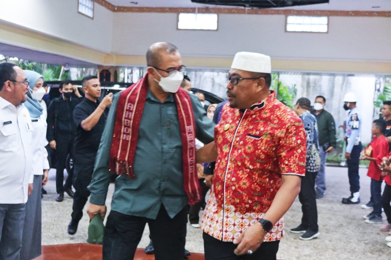 Ambon, MalukuUpdate.com- Gubernur Maluku Murad Ismail menyambut kedatangan Ketua Komisi Pemilihan Umum (KPU) Republik Indonesia, Hasyim Asy'ari, di Bandara Internasional Pattimura, Ambon, Kamis (21/7/2022).